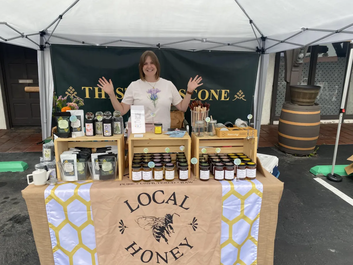 Thisle & Scone partners with beekeepers all throughout southern Orange County. So, our honey is very local, raw, and unfiltered. We have five different perennials right now. Sometimes we even have more than 12. So we're supporting all the micro agriculture in the area, orange blossom, even avocado blossom and our famous wildflower.